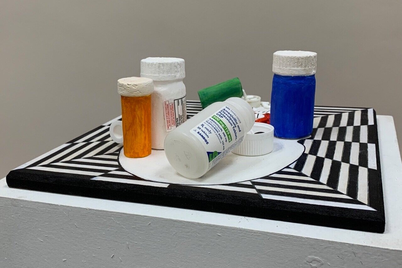 Plaster, Pill bottles, Pills, Acrylic, Wood